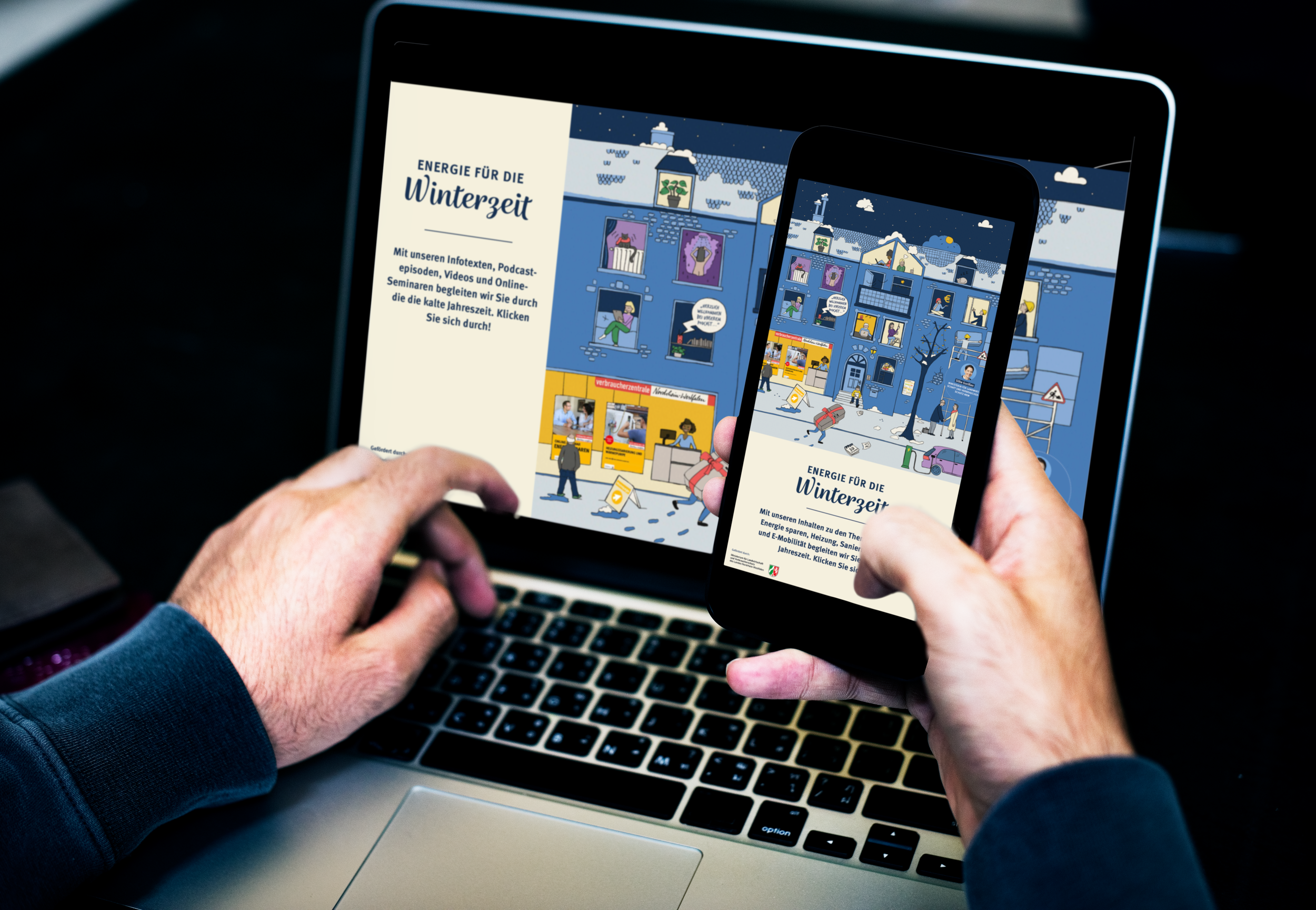 Im Bereich Energie bei der Verbraucherzentrale NRW habe ich eine Illustration für das digitale Projekt „Energie für die Winterzeit“ realisiert. Dieses interaktive Wimmelbild diente als Online-Adventskalender und bot VerbraucherInnen hinter virtuellen „Türchen“ praxisnahe Informationen, Tools und Videos rund um die Themen Energiesparen, E-Mobilität, Photovoltaik und Heizung.