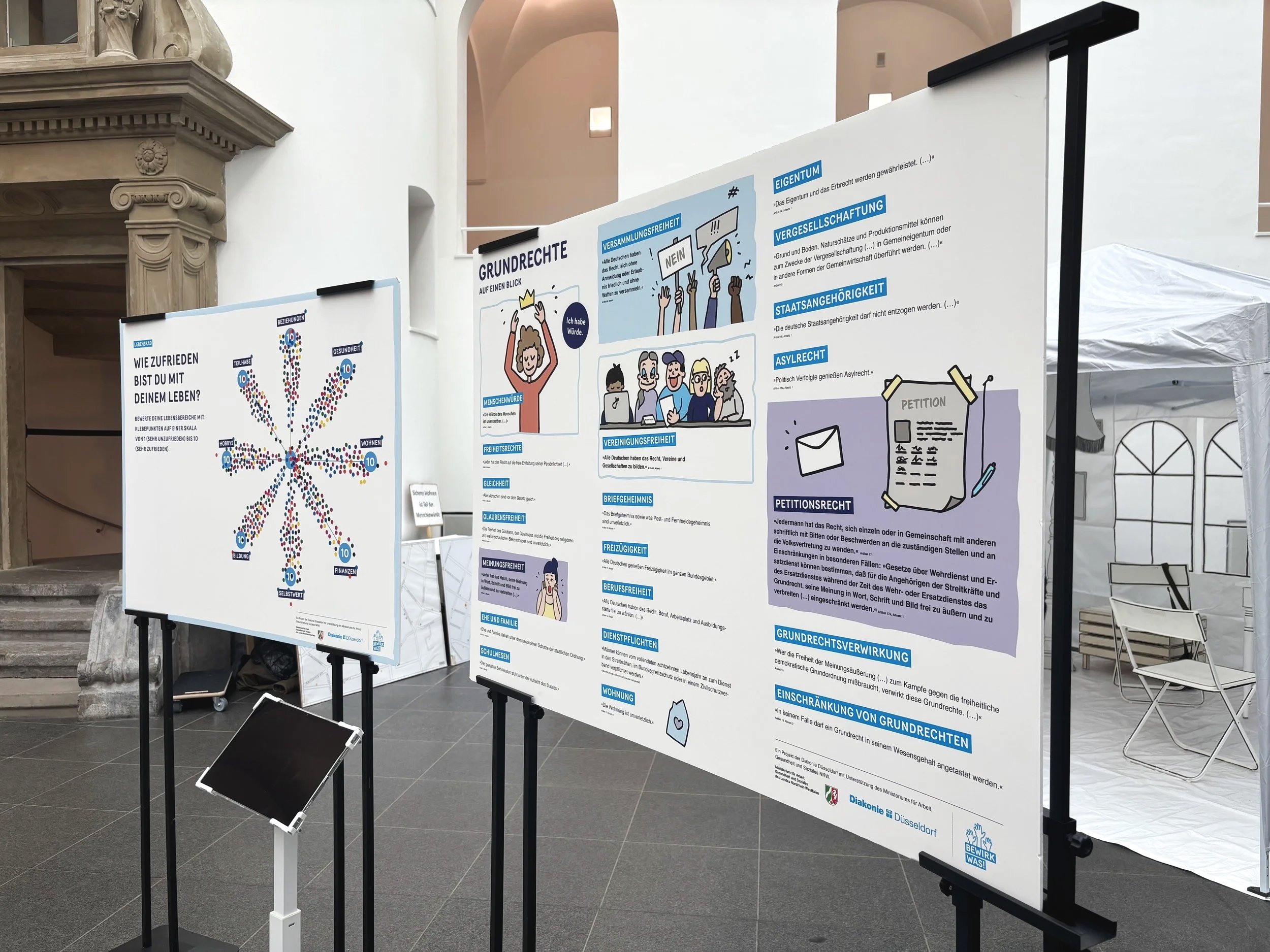 Das Projekt „BEWIRK WAS!“ der Diakonie Düsseldorf richtet sich an armutsbetroffene Menschen und fördert ihre politische Teilhabe. Ziel war ein Rundgang mit digitalen und analogen Angeboten, bei dem Teilnehmende Informationen zu Mitbestimmung und Grundrechten erhalten und aktiv in Aktionen eingebunden werden.